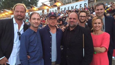 SIE NANNTEN IHN SPENCER celebrates its German cinema release together with 3000 spectators in Europe’s biggest Open Air cinema – Filmnächte Elbufer Dresden. Director Karl-Martin Pold, the protagonists Marcus Zölch and Jorgo Papasoglou, the producers Thomas Král and Undine Filter, Dr. Markus Görsch of MDM – Mitteldeutsche Medienförderung and Torsten Frehse of Neue Visionen Filmverleih…